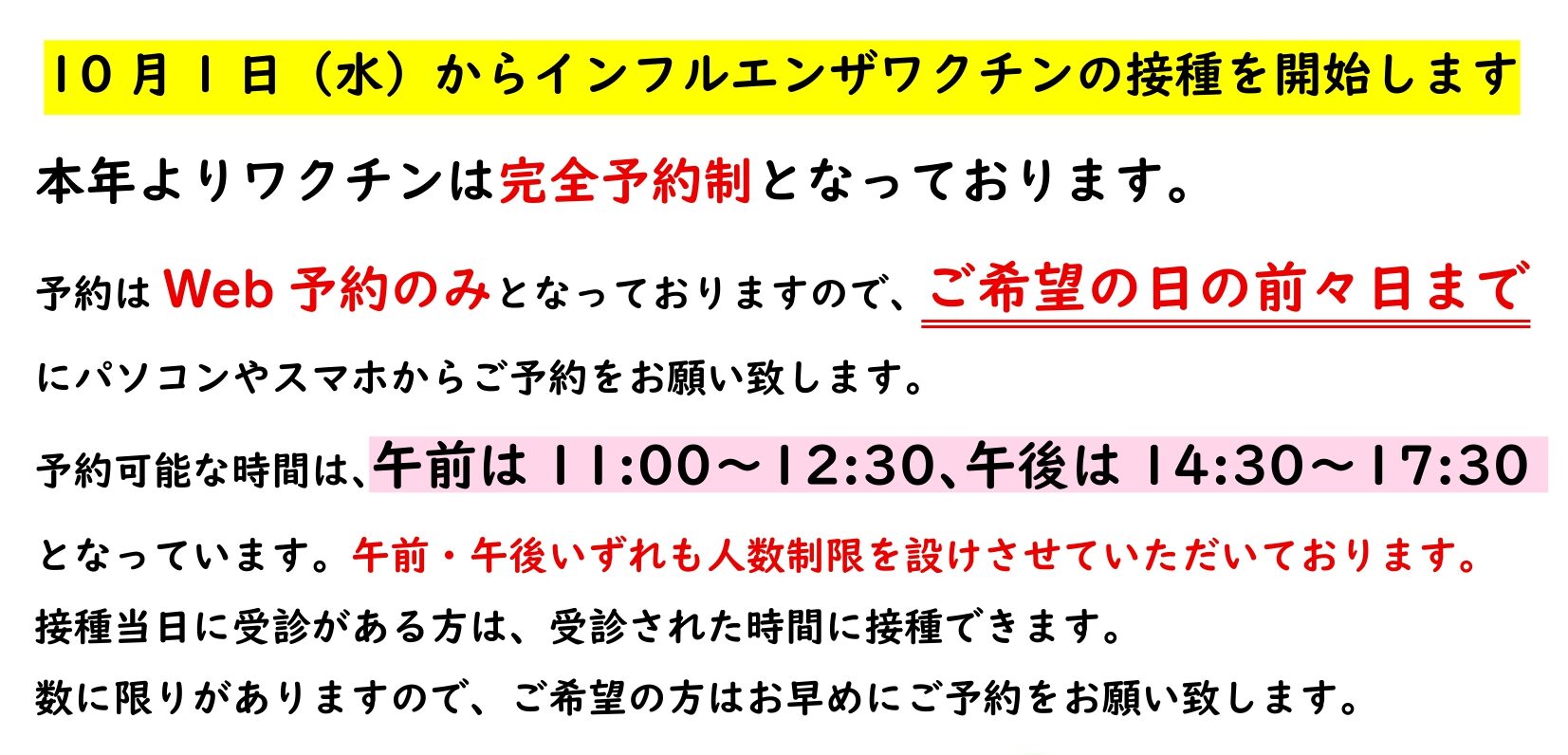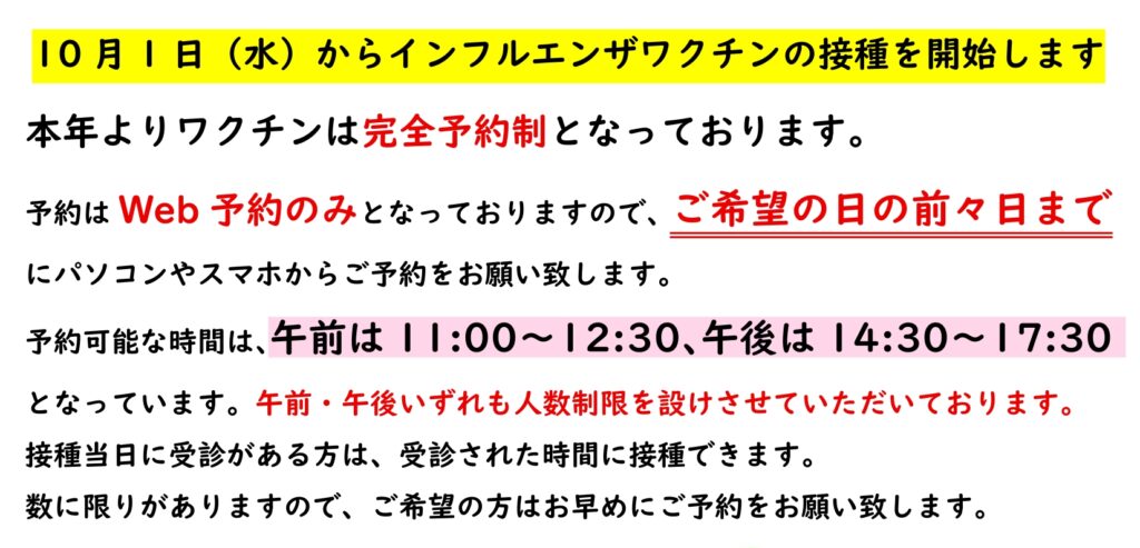 本日、24日より本年度のインフルエンザ予防接種予約を開始いたします。