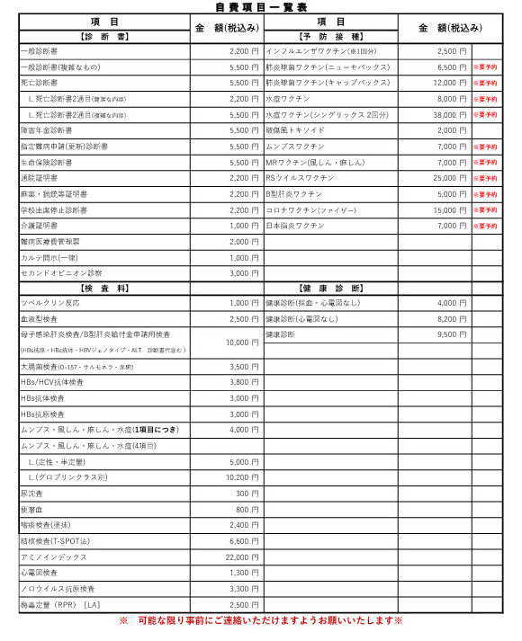自由診療(予防接種・健康診断・診断書・検査) ※2025/10/29更新