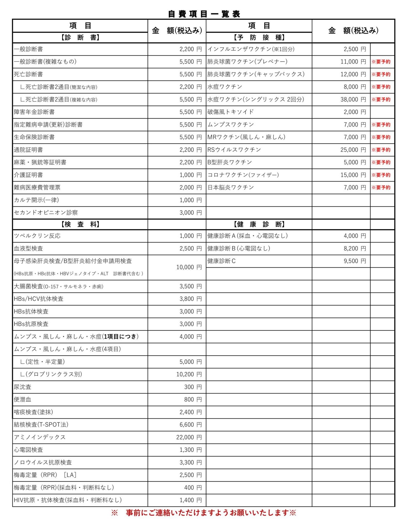 自由診療(予防接種・健康診断・診断書・検査) ※2026/4/1更新